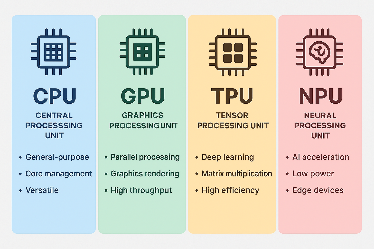 While all four process data, they are optimized for different workloads. This guide clarifies their architectural differences, performance focus, and practical applications in modern AI systems.