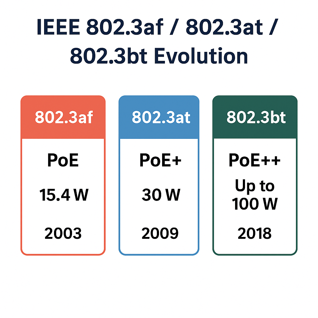 As connected devices demand higher wattage, PoE technology has evolved to keep pace — moving from PoE (15.4W) to PoE+ (30W) and finally PoE++ (up to 100W).
