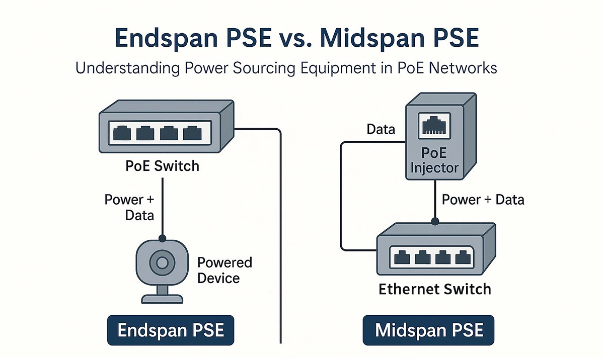 Endspan PSE, often referred to as a PoE switch, integrates power injection directly into the network switch itself.