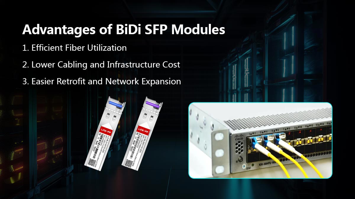The primary advantage of a BiDi SFP is single-fiber duplexing. By reducing fiber usage by 50% per link, it provides measurable benefits in fiber-sparse or cost-sensitive environments: